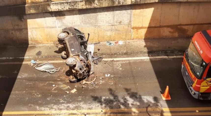 Carro capota e despenca 10 m de viaduto na BR-153; uma pessoa morreu