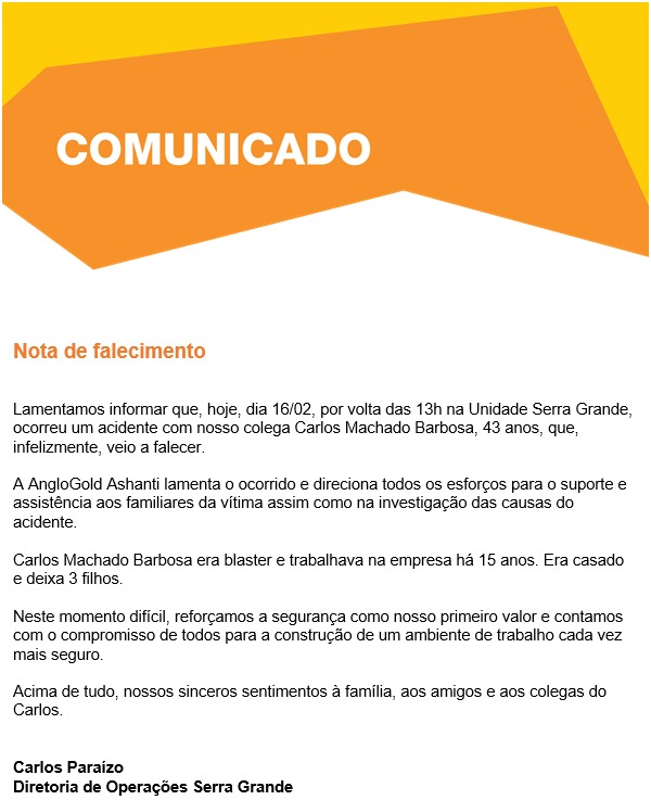 Na tarde desta terça-feira (16/02), um acidente de trabalho na Mineradora AngloGold (conhecida popularmente como SERRA GRANDE), situada no município de Crixás, deixou uma pessoa morta e outra ferida. O fato aconteceu por volta de 13 horas.