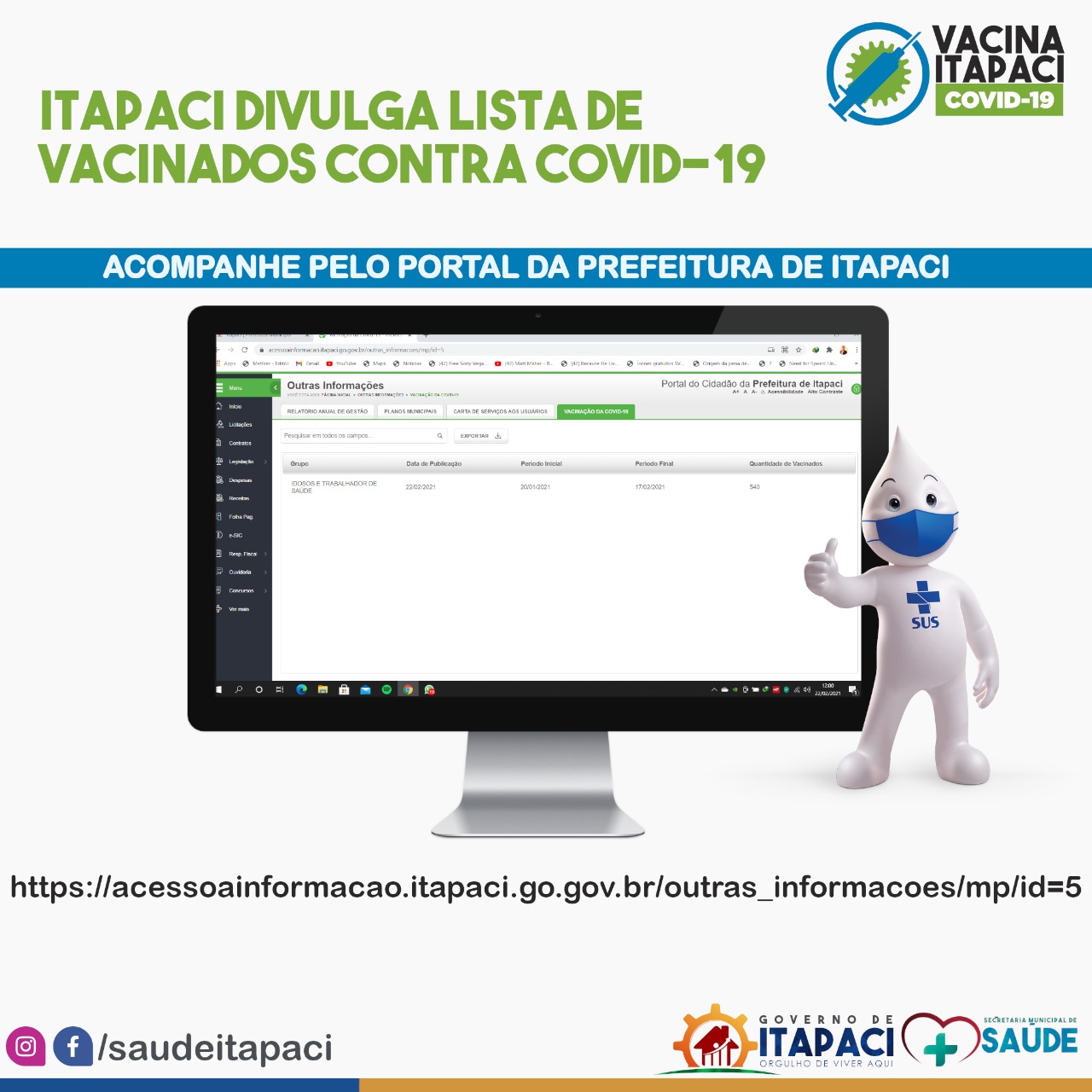 Prezando sempre pela transparência com a população, a Prefeitura de Itapaci por meio da Secretaria Municipal de Saúde divulgou a lista dos vacinados contra a Covid-19 (novo coronavírus) no município.