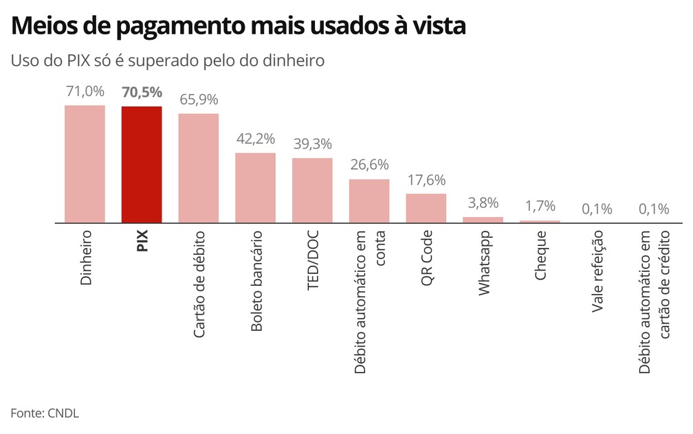 Menos de um ano após começar a funcionar, o PIX já é o segundo meio de pagamento mais usado pelos brasileiros nas contas à vista, aponta pesquisa da Confederação Nacional de Dirigentes Lojistas (CNDL), atrás apenas do dinheiro.