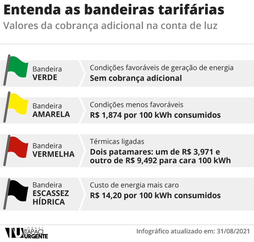 A Agência Nacional de Energia Elétrica (Aneel) anunciou nesta terça-feira (31) um novo patamar de bandeira tarifária para as contas de luz de todo o país. A “bandeira tarifária escassez hídrica” deve entrar em vigor nesta quarta-feira (1º) e adicionar R$ 14,20 às faturas para cada 100 kW/h consumidos.