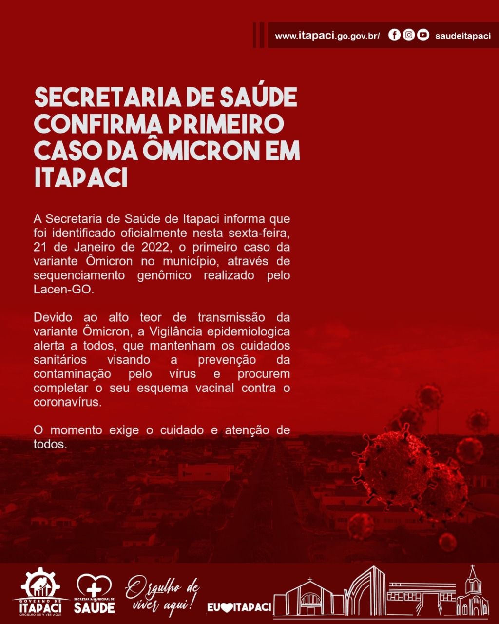 Nesta sexta-feira (21), o Governo de Itapaci através da Secretaria Municipal de Saúde (SMS), confirmou o primeiro caso da variante ÔMICRON no município.