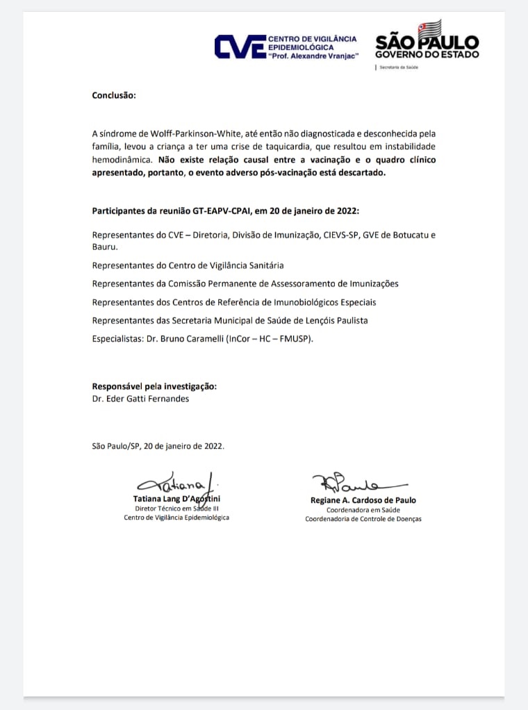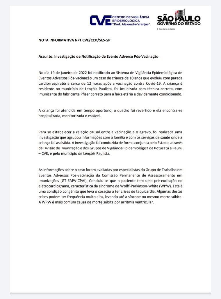 “O Centro de Vigilância Epidemiológica da Secretaria de Estado da Saúde informa que concluiu nesta quinta-feira (20) a investigação que descartou o evento adverso pós-vacinação na criança de dez anos do município de Lençóis Paulista. Não existe relação causal entre a vacinação e quadro clínico apresentado”, diz a nota do governo.