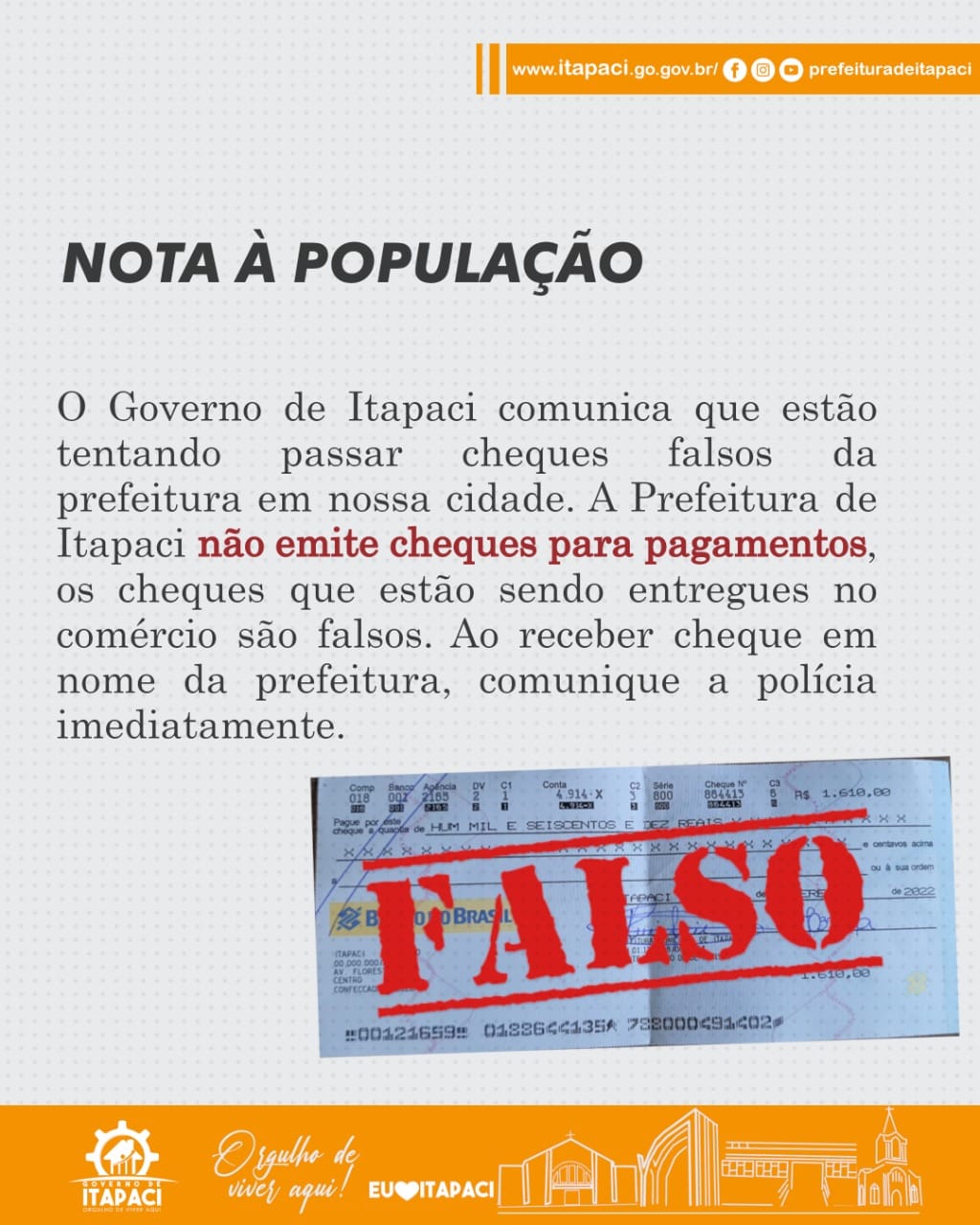 Muita atenção, principalmente a classe comercial de Itapaci, criminosos estão aplicando golpes com cheques falsos com o nominal da Prefeitura Municipal de Itapaci.