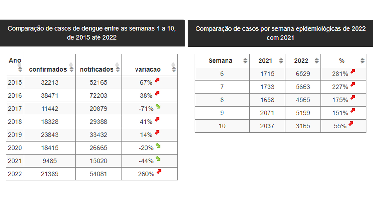 O Estado de Goiás registrou aumento de 260% nos casos notificados e confirmados de dengue nas 10 primeiras semanas de 2022, em relação ao mesmo período de 2021. A décima semana vai de 7 a 14 de março.