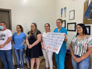 Com vários cartazes com mensagens, os profissionais demonstraram toda a alegria pela valorização realizada pela gestão municipal.