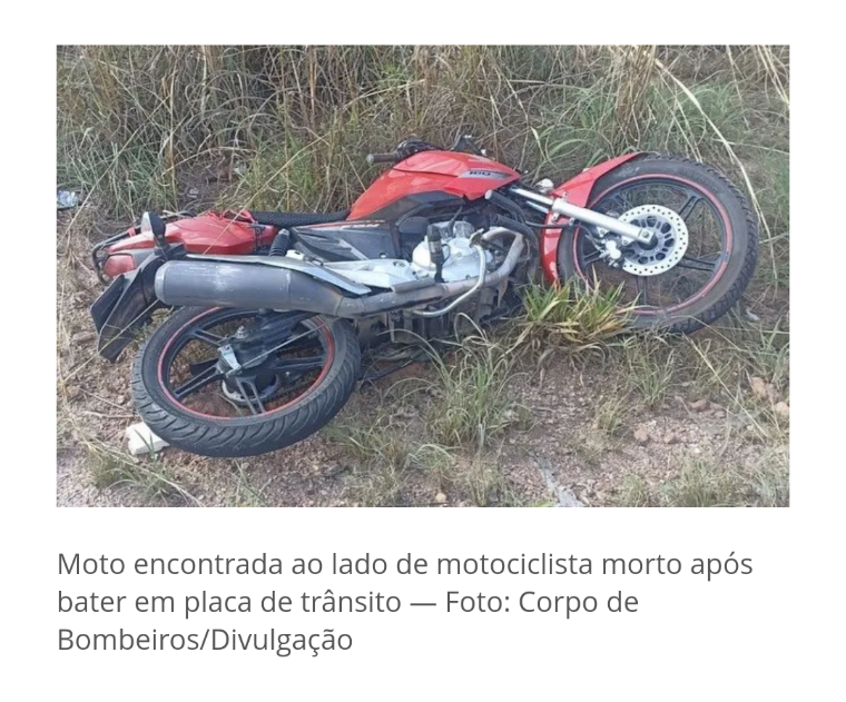 Um homem morreu no último sábado (15/10) após bater contra uma placa de trânsito na GO-403, em Senador Canedo, na Região Metropolitana de Goiânia. Ele estava caído ao lado da moto, que estava deitada fora da pista. Uma das suspeitas é que o motociclista teve um mal súbito e perdeu o controle da direção.