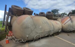 Motorista morre após carreta carregada de cimento tombar na BR-153