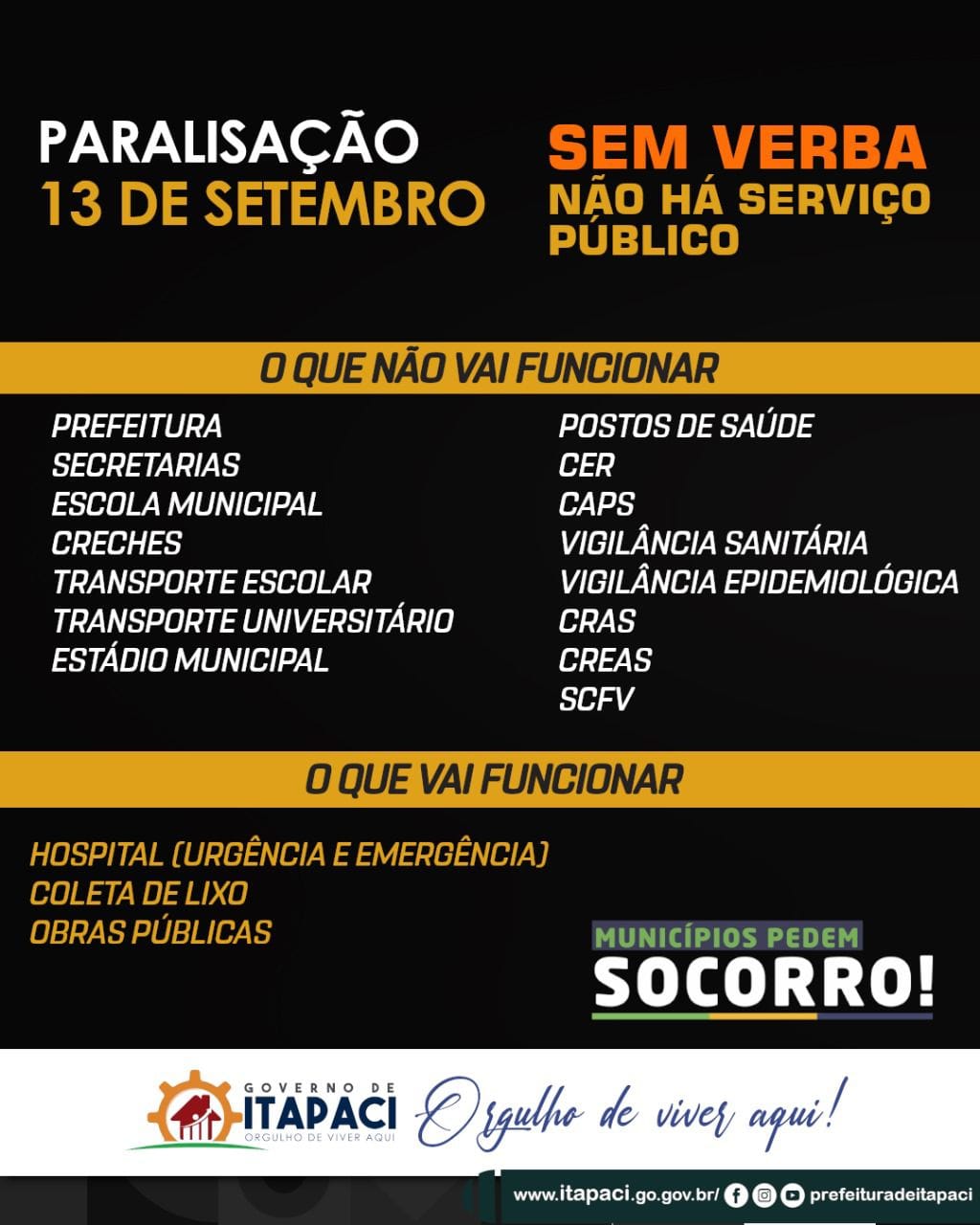 A Prefeitura Municipal de Itapaci assim como demais prefeituras goianas estarão fechadas devido adesão da FGM (Federação Goiana dos Municípios) e da AGM (Associação Goiana dos Municípios) na mobilização estadual de protesto em favor da autonomia financeira dos municípios.