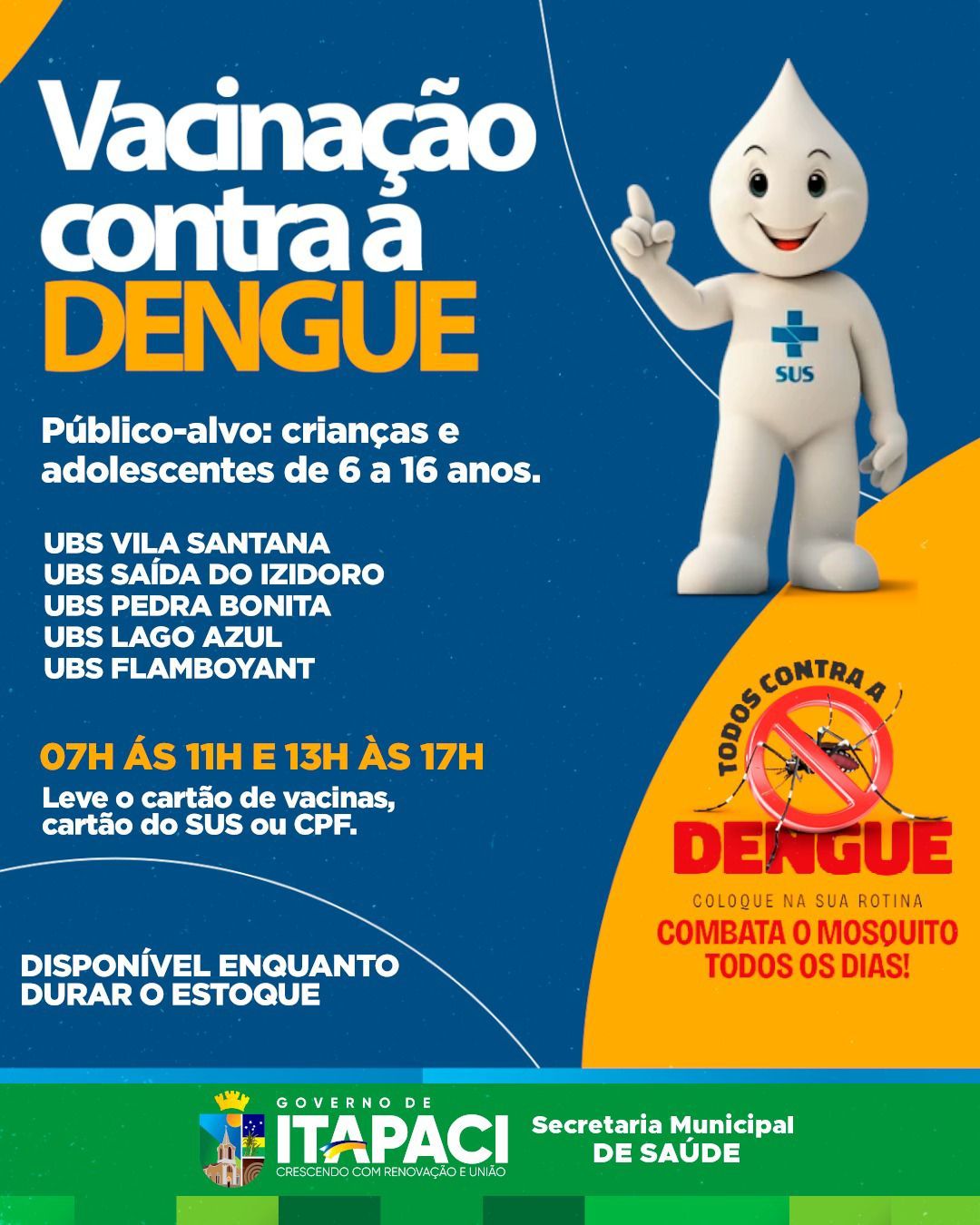 O Governo de Itapaci por meio da Secretaria Municipal de Saúde informa que está disponível a vacinação contra a dengue para crianças e adolescentes de 6 a 16 anos.