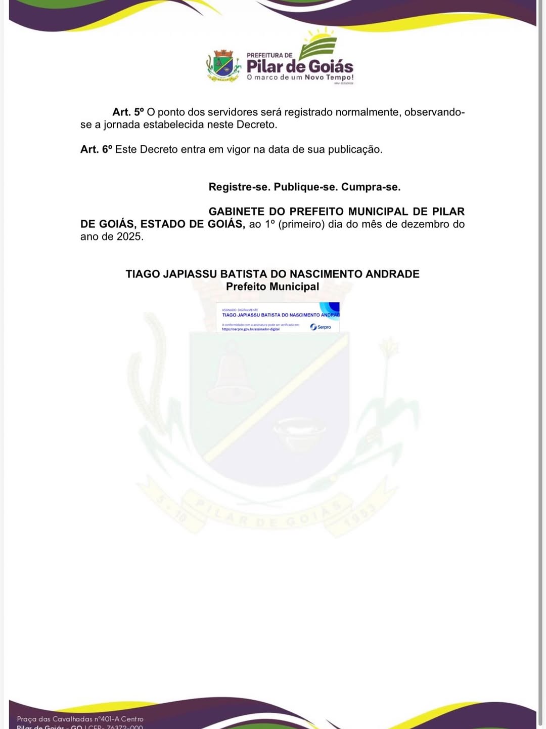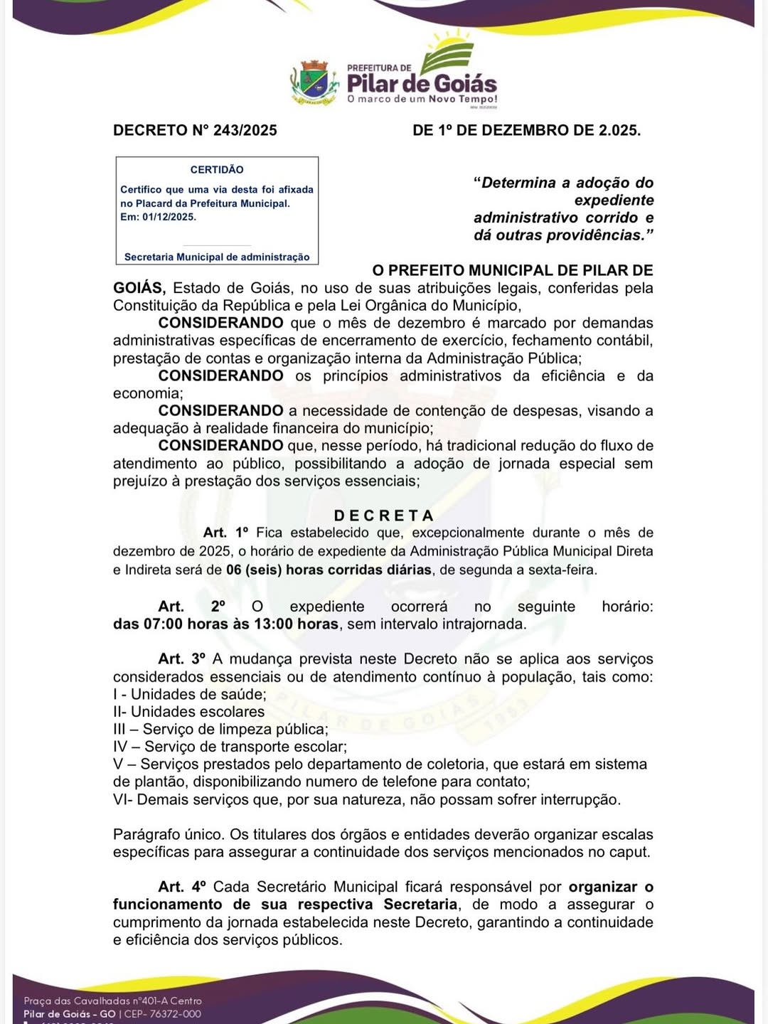 A Prefeitura Municipal de Pilar de Goiás publicou nesta segunda-feira (01/12), um decreto ajustando para seis horas corridas o expediente da administração pública municipal direta e indireta.