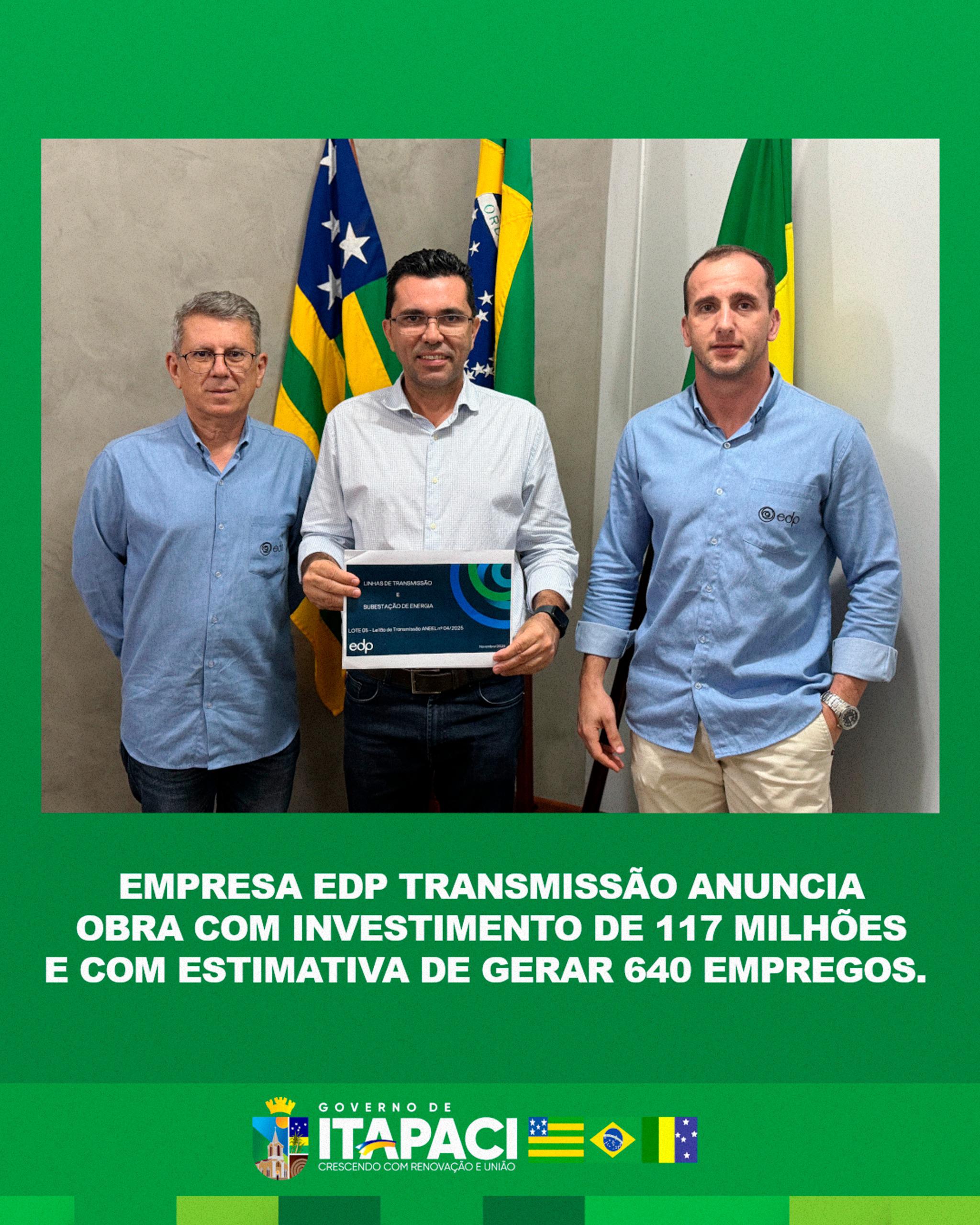 BAITA NOTÍCIA 👏🏻🙏🏻 | O Prefeito de Itapaci, Dr. Fábio de Oliveira, esteve reunido com os representantes da empresa EDP Transmissão, Eduardo e Danilo, para tratar de uma grande conquista para o futuro do nosso município.