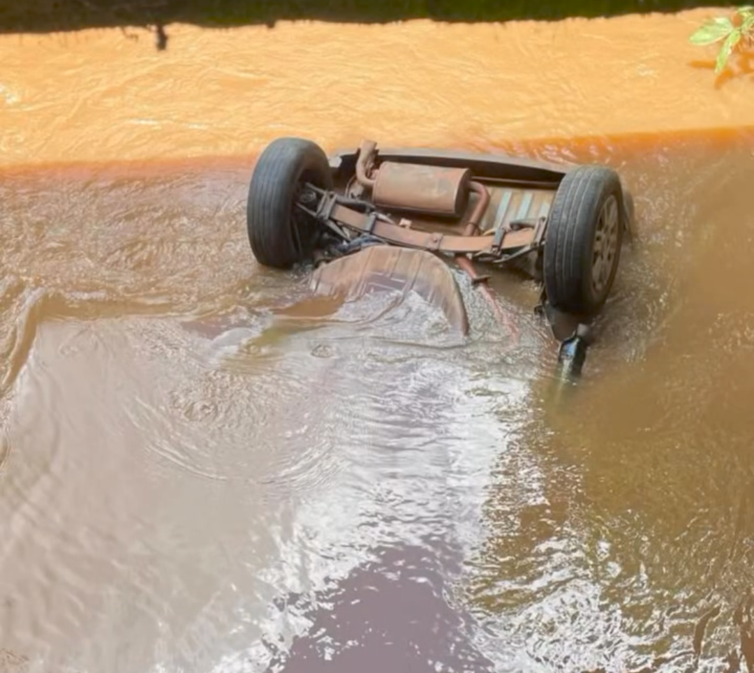 Ao chegarem ao local, os militares constataram que um veículo havia caído de uma ponte, ficando capotado e submerso em um curso d’água. Três pessoas estavam no automóvel. Duas vítimas já se encontravam fora do carro, conscientes e com escoriações leves.